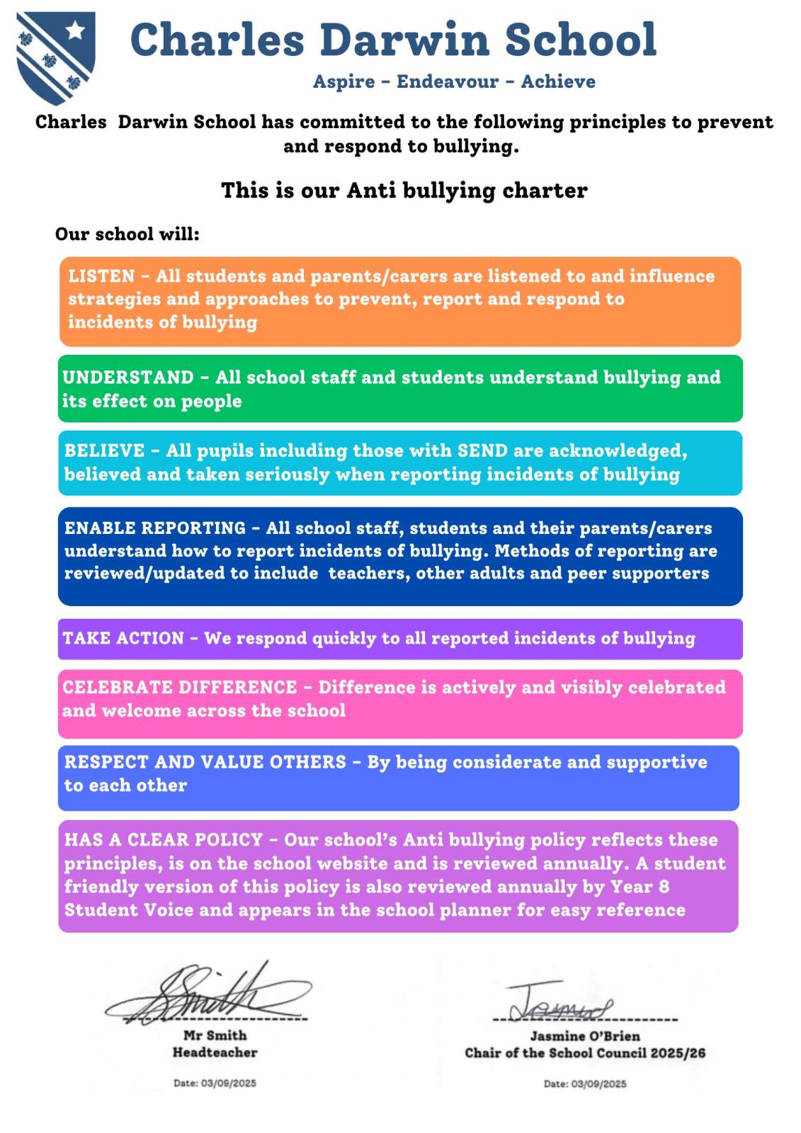 Need to report you are being bullied ? Please scroll down to see the email to do this. Remember, Charles Darwin school takes the message of Anti bullying seriously. We are here to help you and keep you happy and safe.
